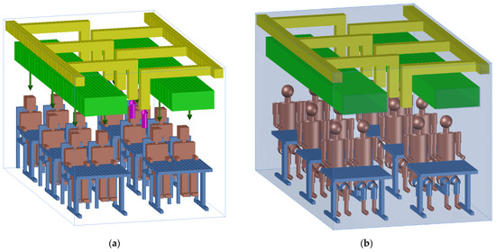 Scheme of the virtual chamber, equipped with ceiling-mounted localized air distribution and exhaust systems used in the: (a) CFD model; (b) HTR model. The occupants are brown; desks and seats are blue; inlet ceiling-mounted localized air distribution system is green; inlet jet airflow is represented by green arrows; exhaust ventilation systems are represented by yellow; and outlet jet airflow is represented by magenta arrows.