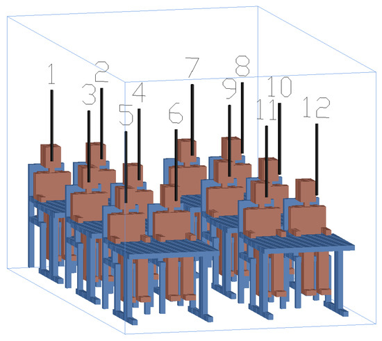 Figure 3a shows the inlet jet airflow (green arrows), located above the head level and in front of the occupants, used in the CFD numerical simulation, while Figure 4 shows the location and identification (by a number between 1 to 12) of the occupants seated in the virtual classroom, used in the CFD and HTR numerical simulations.