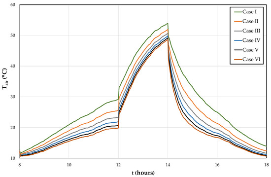 Finally, the ADI varies between 2.6 obtained for Case I and 11.0 obtained for Case V at 10 h, and between 2.6 obtained for Case I and 13.4 obtained for Case V at 16 h. It is higher at 10 h than at 16 h. According to Awbi [30], in general, an ADI value greater than 10 shows that a ventilation system exhibits good performance. This is achieved for Cases IV and V at 10 h, and for Cases V and VI at 16 h.
