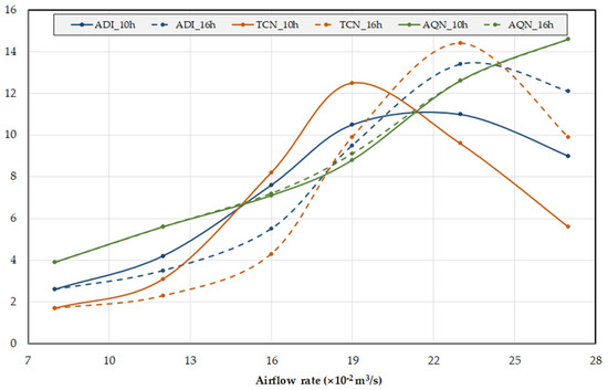 - The ADI increases initially but after a certain airflow rate it decreases. The inversion is verified at 10 h for an airflow rate around 0.225 m3/s and at 16 h for an airflow rate around 0.240 m3/s. The ADI is higher at 10 h than at 16 h until an airflow rate of 0.205 m3/s is provided. After this airflow rate, the ADI is lower at 10 h than at 16 h.