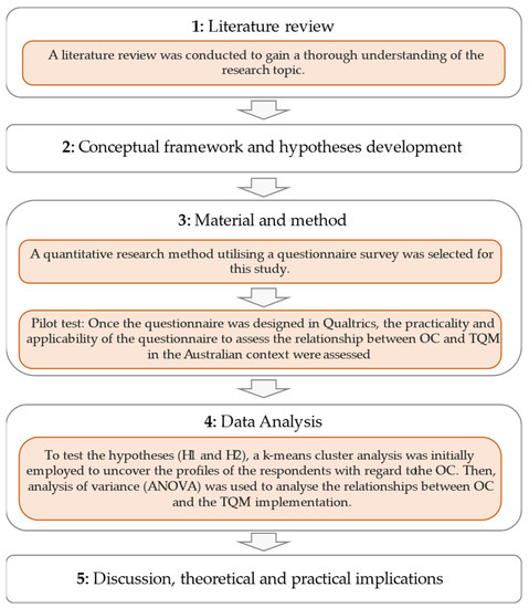 The study adopted seven TQM practices used by Jha and Iyer [58], and an additional factor presented by Androwis, et al. [59] as indicators of TQM implementation. However, only items that had normality based on the Kurtosis and Skewness indices were included. The respondents were asked to measure the TQM practices using a 5-point Likert Scale. The TQM practices employed were respectively: (1) top management commitment and leadership; (2) employee empowerment and participation; (3) customer focus and satisfaction; (4) training, education, and reward; (5) supplier management; (6) continuous improvement; (7) process control and improvement; and (8) information technology. The construct validity of the study was ensured by the logical assessment of the literature [60]. This process represents the extent to which the concept under research is represented by the scale’s items. Once the questionnaire was designed in Qualtrics, the practicality and applicability of the questionnaire to assess the relationship between OC and TQM in the Australian context were determined by sending the questionnaire to four experts, including two academics and two professionals with over 10 years of experience in quality management tools and techniques. The feedback was also requested to acknowledge, identify, and eliminate any errors existing in the online questionnaire. This process could be considered as a pilot stage. To test the hypotheses (H1 and H2), a k-means cluster analysis was initially employed to uncover the profiles of the respondents with regards to the OC. Then, analysis of variance (ANOVA) was used to analyse the relationships between OC and the TQM implementation.