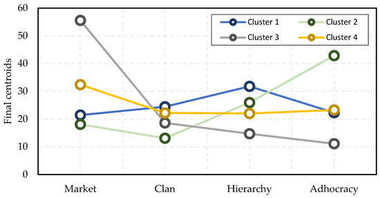 According to Table 4, the four articulated clusters illustrate four distinctive combinations of the OC factors. Firstly, cluster 1 (n = 14) is dominated by the hierarchy (31.79) and clan (24.46) cultures. Secondly, cluster 2 (n = 7) is dominated by the adhocracy (42.86), and hierarchy (25.95) cultures. Thirdly, cluster 3 (n = 6) is strongly dominated by the market culture (55.56). Finally, cluster 4 (n = 15) is predominantly dominated by market (32.4), and sequentially by adhocracy (23.27) cultures. Based on the CVF, the four formulated clusters can be distinguished through endorsing certain aspects of the two key dimensions which were identified by Cameron and Quinn [15]. The first cluster can be named internal focus, followed by the second cluster being acknowledged as balance focus, whilst the third cluster can be identified as market focus, and finally, the fourth cluster as external focus.