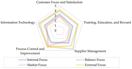As described earlier and illustrated through the cluster analyses results, the internal focus culture is overshadowed by the hierarchy and clan cultures. This type of culture focuses on enhancing formalisation and embracing collectivism through teamwork. There is a focus on internal procedures which fosters socio-technical systems and gain through human resource development, stability, and mutual consensus [15]. Moreover, the balance focus culture entailed adhocracy and hierarchical cultural characteristics, possessing a mixture of a dynamic entrepreneurial environment through the appreciation of individual initiative and liberty and the application of measurement and quality tools [15], whilst the market focus culture is concerned with the external environment through transaction costs, hence outpacing competitors through being the market leader [15]. Additionally, the external focus cultural conglomerate is dominated by the market and adhocracy typologies. This cluster emphasises the combination of embracing individual initiative and liberty by fostering an entrepreneurial environment, which aids in endorsing external competitiveness by focusing on developing competitive advantages [15]. Based on the analysis of the clusters and TQM integration, it is evident that the external and market focus clusters, which entail a mix of market and adhocracy cultural characteristics, are more favourable for TQM integration than the internal focus and balance focus clusters, which entail a mix of the hierarchy, clan, and adhocracy cultural characteristics.
