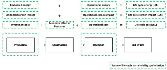 As shown in Figure 1, the sustainability optimization in this study focuses on energy use, carbon impact, and costs from a life cycle perspective. In terms of energy use and carbon impact, the study includes (1) the embodied primary energy use and CO2 emissions caused by off-site production of materials and components from raw material acquisition, as well as (2) the primary energy use and CO2 emissions caused by heating, hot water use, and operational electricity during the building operational phase. In order to make the results of optimization comparable, the life cycle cost analysis in this study has a similar scope as the Life Cycle Energy (LCE) and Life Cycle Carbon Impact (LCCI), which is the sum of the present value of (1) the investment cost for materials and components procurement, (2) the operational costs associated with the energy use over the building’s life, as well as (3) the profitability of saleable/rentable floor area, which can be affected as a by-product of using passive energy efficiency measures. The main reason for only including the embodied energy and embodied carbon impact of the production phase in this study is because the previous studies indicate that, when the operational phase is excluded from the system boundary, the production phase can account for up to 75% of the total life cycle energy use and carbon impact [33,34,35]. Further, the building’s lifespan is assumed to be 50 years in this study, based on the previous studies carried out in the context of LCE and LCCI analyses [33].