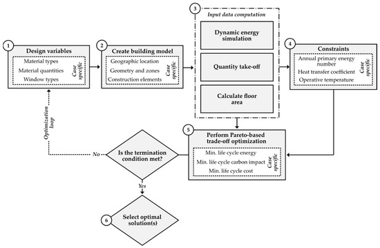 The multi-objective optimization was performed by combining an optimization algorithm with different computations (e.g., energy simulation), and finding optimal solutions using a multi-objective optimization method. This set-up enabled the search for optimal solutions based on a set of design variables, objectives (e.g., various sustainability criteria), and constraints. For the optimization algorithm, a stochastic population-based genetic algorithm was used. These algorithms have been described in previous research as being robust when used for large-scale problems, and especially with respect to discontinuities that may occur if discrete variables are used or from the output of energy simulation engines [20,36,37]. Pareto optimization [38] was used as the multi-objective optimization method, which identifies optimal solutions by searching a set of feasible trade-off solutions. Pareto optimization was used instead of, for example, scalarization, where weight factors are used in the construction of objective functions, as estimating these weight factors have inherent difficulties [20]. Lastly, Pareto optimization also has the benefit of exposing the optimization problem and the optimal solutions to a more in-depth analysis, where the optimal solutions can be further analysed to gain knowledge [39]. The process that was used to carry out the multi-objective optimization is outlined in Figure 2.