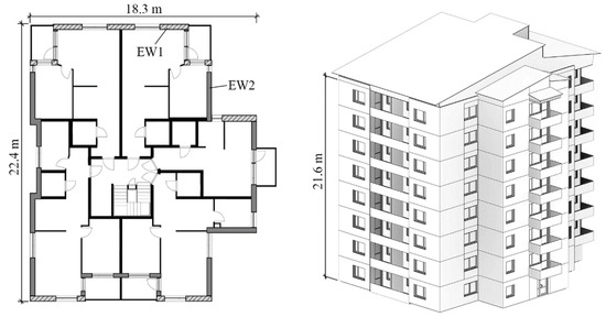 The building studied in this case study is an apartment based on a standardized building concept that is developed for the possibility of being built in different locations in Sweden. This standardized concept has a high level of pre-engineering with a short design process because the architectural and other technical designs have been largely prepared and developed through iterative approaches. Hence, the short design process and pre-prepared design solutions contribute to cost-effectiveness in this standardized building concept compared with conventional building design approaches. Although the annual energy use and investment costs of this building concept have been improved through standardization and iterative approaches, its selection for this study may have great potential for new design solutions to further improve their sustainability performances from a life cycle perspective. The building concept has eight stories (21.6 m height which is considered a high-rise apartment based on [60]) where each story has 2.4 m internal height. The high-rise building consists of 39 apartments, a total heated floor area of 2478 m2, and 340 m2 glazing area (almost 14% of the heated floor area). The heating system in each apartment comprises hydronic radiators which are connected to the city’s district heating grid through heat distribution units. The building is also equipped with an air-to-air heat exchange ventilation system (with 80% efficiency) which recovers and transfers the heat in the exhaust air to the supply air. Figure 3 shows a plan view and 3D view of the high-rise apartment building concept.