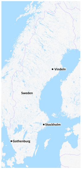 This high-rise apartment building is located in Vindeln, a small city situated almost 680 km north of Stockholm, Sweden. Vindeln has a subarctic climate, characterized by dark and cold winter days ranging from −3 °C to −14 °C, and an annual mean outdoor temperature of 3.4 °C. As this standard building concept could be built in other locations with the same design, the building was modelled and optimized as if it was situated in two other cities, namely Stockholm and Gothenburg (see Figure 4). This enabled the exploration and understanding of how the life cycle sustainability performance of this building concept could be affected due to the variation in climate conditions, real estate values (where the building is sold after construction), energy supply prices, etc., in other locations. The possibility of this building concept to be built in different locations with the same design made it a representative case for the purpose of this study and therefore was selected and explored herein.