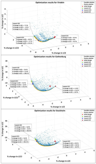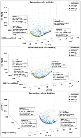 Figure 5. The life cycle energy, carbon impact, and cost values of feasible solutions obtained from the multi-objective optimization for the building concept in Vindeln, Gothenburg, and Stockholm. A colour print is recommended.