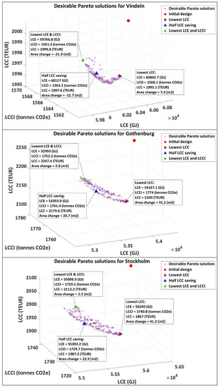 Table 7. List of three desirable Pareto solutions and their design variables for different locations. These solutions are (1) the desirable Pareto solution with lowest LCC, (2) the desirable Pareto solution with the lowest environmental impact (i.e., LCCI and LCC), and (3) the desirable Pareto solution with half LCC saving relative to the solution providing lowest LCC. Minus signs in this table indicate a reduction in floor area relative to the initial design’s total floor area.