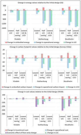 Figure 6. The percentage change in energy, carbon impact, and cost values of the feasible solutions relative to the initial design of the building concept for different locations. A colour print is recommended.