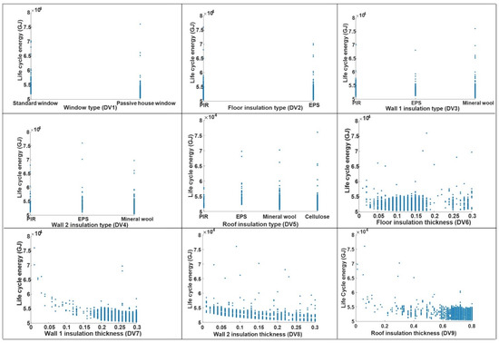 The scope of life cycle sustainability optimization was described earlier in Section 2.3. It should be noted that the embodied energy, embodied carbon impact, and investment cost associated with the production and procurement of mechanical systems (i.e., plumbing, heating, and air-conditioning systems) are excluded in the sustainability analysis and optimization of the building example presented here. The main reasons for excluding the impact of mechanical systems were lack of appropriate embodied data for such systems as well as the focus of the case study, which was mainly on finding optimal solution(s) for passive energy efficiency measures rather than active energy systems. Furthermore, when evaluating energy use, carbon impact, and cost of building operation for the case study, the household electricity usage was excluded as it is mainly dependent on occupant behaviour as well as household devices. Additionally, apart from investment and operational costs, the LCC results presented further below only indicate the economic losses/gains associated with the changes in floor area for each new solution relative to the initial design’s total floor area. This is mainly due to the dominance of the building’s total real estate value (where the building is sold after construction) in the LCC result, especially in locations with high real estate values, which would make it potentially difficult to show changes in the LCC value for each new solution.