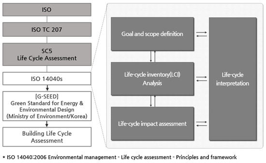 LCA quantitatively assesses potential environmental impacts that may arise from inputs and outputs throughout the life cycle, including the production, construction, operation, and disposal of building materials [13,14,15,16,17,18]. According to ISO 14040s, LCA consists of four stages: goal and scope definition, life-cycle inventory (LCI) analysis, life-cycle impact assessment, and life-cycle interpretation (ISO/FDIS 14040, 2006). Figure 1 shows the structure of LCA according to ISO 14040s. Figure 1 shows the composition of LCA.