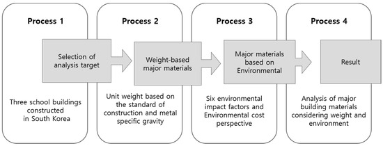 Figure 2 shows the proposed analysis method. In this study, major building materials required as database input in the production, construction, and disposal stages, which account for 40% of the environmental impacts occurring in the whole life cycle, were analyzed. It is possible to simplify the environmental impact assessment of buildings on the environmental impacts of production, construction, and disposal by selecting major building materials. First, weight-based building materials were analyzed to find the major building materials among building materials used in the construction of school buildings. In addition, major building materials were analyzed from an environmental perspective to identify materials with high environmental loads even though they can be excluded by the weight-based method. First, major building materials were analyzed for six environmental impact categories: global warming potential (GWP), abiotic depletion potential (ADP), acidification potential (AP), eutrophication potential (EP), ozone layer depletion potential (ODP), and photochemical oxidation potential (POCP). Then, the materials were analyzed from an environmental perspective after integrating the six environmental impact categories into the KOLID environmental cost. Through the analyzed results, major building materials were identified for school buildings in terms of weight and environment.