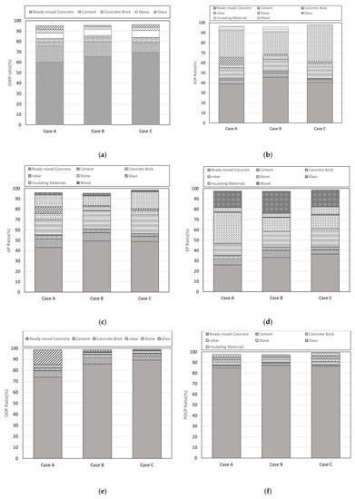 Figure 3 shows the major building materials in the six environmental impact categories for cases A, B, and C. For GWP, the major building materials were ready-mixed concrete, concrete bricks, cement, aggregate, rebar, stone, and glass. Ready-mixed concrete, insulating materials, rebar, glass, metals, cement, concrete bricks, and stone were found to be the major building materials for ADP. For AP, the major building materials were ready-mixed concrete, rebar, insulating materials, cement, stone, concrete bricks, and wood. For EP, they were ready-mixed concrete, cement, concrete bricks, rebar, stone, and glass based on the exclusion criterion of 95%. Ready-mixed concrete, cement, concrete bricks, rebar, and glass were analyzed to be the major building materials for ODP, while ready-mixed concrete, glass, rebar, cement, and insulating materials were found to be the major building materials for POCP.