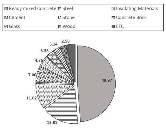 Therefore, in this study, the five building materials that met the exclusion criterion of 95%, including ready-mixed concrete with the highest weight ratio, were selected as the weight-based major building materials for school buildings. It appears that different analyses will be possible depending on the use of buildings.