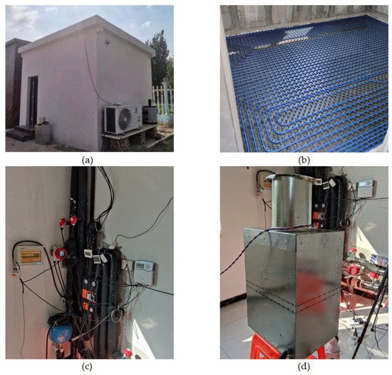 Photographs of the floor plan and experimental building. (a) Experimental site, (b) pipe with counter flow type laying, (c) control system components, and (d) indoor heat source.
