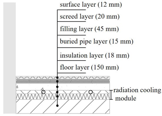Figure 2. Its basic structure from the bottom to top was made of the following parts: floor layer, insulation layer, buried pipe layer, soil layer, screed layer and surface layer, where the insulation layer and buried pipe layer for integrated processing were combined into a radiation cooling module. The radiant floor thermal parameters are listed in