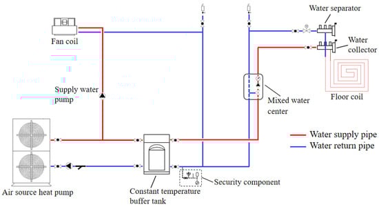 Figure 4. The RFCAFC system consisted of a cold source, a constant temperature water tank, a primary distribution system, a secondary distribution system (mixer pump), a safety component, and an air conditioning terminal.