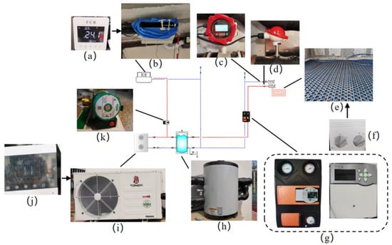 Illustrated schematic of the cooling system, (a) temperature controller of fan coil, (b) fan coil, (c) flow meter, (d) thermometer, (e) radiant floor coil, (f) temperature controller of radiant floor, (g) mixed water center, (h) constant temperature buffer tank, (i) air source heat pump, (j) controller of air source heat pump, (k) supply water pump.