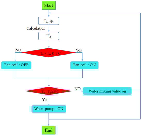 As a radiant floor is more prone to condensation in high a humidity environment, the combined cooling system adopted the operation logic that the floor radiation water supply temperature should be higher than the indoor air dew temperature to prevent condensation. The specific implementation was as follows: The radiant floor water supply temperature always followed the indoor air dew temperature. An indoor dew thermostat collects the indoor air temperature and humidity and transmits the data to the central controller, which calculates the dew temperature based on the indoor temperature and humidity and the built-in enthalpy and humidity graph algorithm, and then adjusts the mixing valve at the mixing pump station to adjust the water temperature so it is higher than the dew point temperature by 2 °C, thus realizing the control logic flow, as shown in