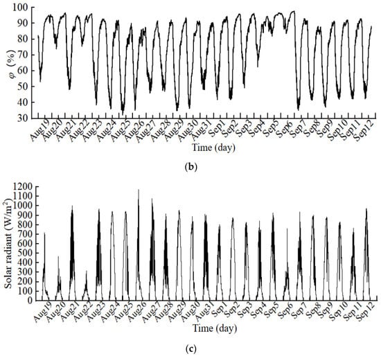 Meteorological conditions during the experiment, (a) outdoor air temperature, (b) outdoor air relative humidity, and (c) solar radiation.