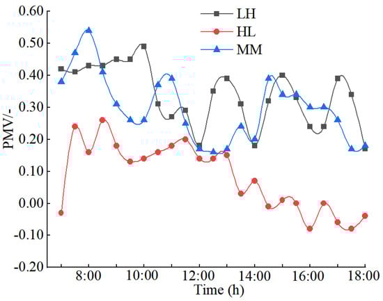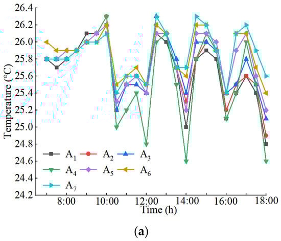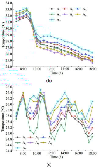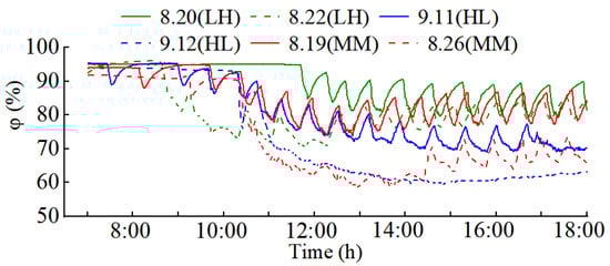 Table 5. When the outdoor temperature and humidity ranges were 21–29 °C and 74–94%, respectively, the conditions were referred to as low temperature and high humidity (LH). When the outdoor temperature and humidity ranges were 24–38 °C and 42–90%, respectively, the weather conditions were referred to as high temperature and low humidity (HL). When the outdoor temperature and humidity ranges were 22–33 °C and 50–88%, respectively, the weather conditions were referred to as medium temperature and medium humidity (MM).