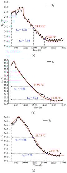 Temperature change of the radiant floor surface, Tf change during the (a) LH, (b) HL, and (c) MM operating strategies.