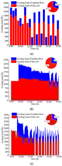 Cooling loads taken on by radiant floor and fan coil under the (a) LH, (b) HL, and (c) MM operating strategies.