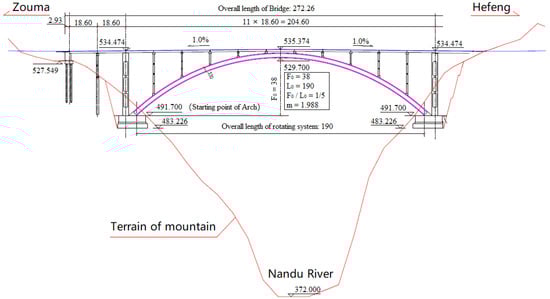 The construction of the Nandu River Swing Bridge is taken as an engineering case study (shown in 0); the bridge is the largest concrete spherical joint swing bridge in China, spans 190 m (L0), and is located in the Enshi province. The sagitta height (F0) is 38 m and the F0/L0 ratio is 1/5. Meanwhile, the arch axis coefficient (m) is 1.988. The design speed of the bridge is 40 km/h. The rotating system is formed by the rigid skeleton and the bottom of the rigid skeleton is cast by the concrete. The back wall provides a balanced weight during the process of rotating construction. The reinforced concrete spherical joint is cast by C50 concrete. Detailed information, in terms of the back wall and the spherical joint, is presented in Section 4 and Section 5. Figure 2 shows the bridge layout of the Nandu River Swing Bridge.