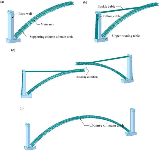 - Structural stiffness increases after the closure and the dismantlement of the cable, and the structure is in a stable state (Figure 3d). The entire structural weight is forced by the arch foot, forming the non-hinged arch. Under the action of self-weight and external load, the bending moment distribution in the arch is uniformly distributed along the main arch;