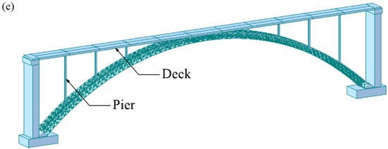 - The pier founded on the main arch and the bridge deck are cast during the programmatic process, and the ancillary facilities are installed in sequence (Figure 3e).