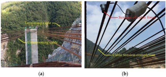 After the building procedure of the upper rotating table, back wall, and main arch, the weight of the main arch structure is not transferred to the position of the upper spherical joint [6]. The buckle cable and pulling cable are anchored alternately (Figure 5a), and are able to gradually transfer the weight of each part to the spherical joint position. The stages of cable tension are from a to k, which are shown in Figure 5. At stage a, the pulling cables are anchored. Then, the buckle cables are anchored at stage b. After stage a and b, the tension of pulling cables increases at stage c. Subsequently, the tension of the buckle cable increases at stage d. To prevent the cracking of the concrete back wall caused by too much tension in the cables, the tension of the pulling cables and buckle cables are increased alternately in the following stages of cable tension until stage k. The complete rotating system (Figure 5b) is formed by the construction procedure to ensure that the back wall concrete does not exceed the affordability of the tensile and compressive stresses.