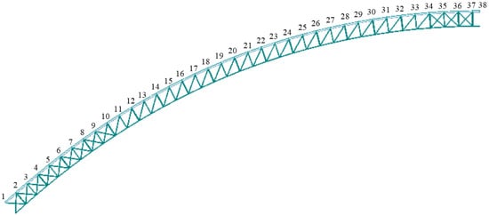 The results of the vertical displacements (No. 10, 19, 27, 36, and 38) during the cable tension stage are shown in Table 1. As can be seen, No. 19 had the largest vertical displacement during the cable tensioning process. This was due to the gravity and tensioning process bending the middle part of the arch. Special attention to the middle position of the main arch is recommended during the cable tensioning process.