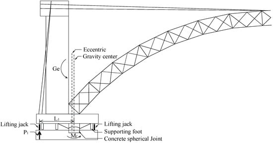 - After the tension of the buckle cable and pulling cable, the entire rotating system is supported by the concrete spherical joint. If the gravity center of the system coincides with the axis of the concrete spherical joint, the system is only held up by the upward force of the concrete spherical joint. The overturning resistance of the entire system is kept in a low-security state; therefore, the closure procedure needs to be implemented immediately (Figure 3b);