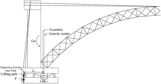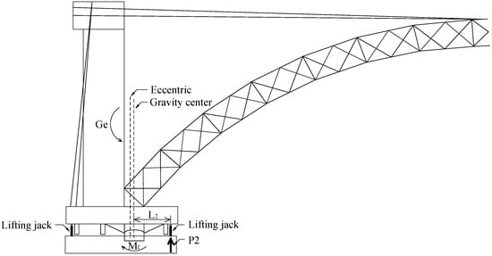 When the supporting foot is on the slideway, the lifting jack is applied only on the same side of the supporting foot (Figure 9). When the lifting force is increased, the static friction force of the rotating system becomes a dynamic friction force at a specific value. At this time, the lifting moment () is equal to the sum of the friction moment () and the unbalanced moment (). The spherical joint rotates instantaneously and slightly. Meanwhile, the data of the vertical and horizontal displacement sensors change instantaneously and significantly. Therefore, the lifting force P1 increases to the maximum value.