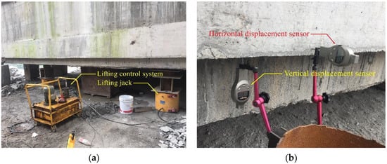 When the temporary constraints of the rotating system were lifted all the dial indicator readings remained unchanged, i.e., the rotating system did not rotate, so it was known that the system belonged to the situation of . The test results with the lifting jacks on both sides are shown in Figure 13.