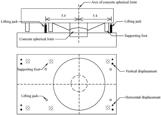 Rotating construction is utilized in long-span swing bridges, and the superstructure of swing bridges commonly utilize long-span cantilever structures. However, they are easy to overturn and collapse during the rotating construction process [8]. During the rotating process, all the mass of the rotating system is applied to the upper rotating table, and lifting jacks push the upper rotating table to rotate the rotating system to a specific position of bridge arch closure. The rotating system and the spherical joint (Figure 1b) are hinged to the lower rotating table. Therefore, the fraction between the upper spherical joint and the lower spherical joint provides resistance to the structural overturn of the rotating system [9]. Therefore, the entire building process and the subsequent analysis of the swing bridge are important to bridging security. Simultaneously, unbalanced weight results in the gravity eccentric of the rotating system. The gravity eccentric can cause a large overturning moment, resulting in the overturn of the whole structure [10]. Alocci et al. [11] studied the lightweight swing bridge, and the main span of the bridge was 21.26 m. A feasibility study presented an asymmetric, cable-stayed, pedestrian swing bridge. However, the construction of bridges crossing valleys or rivers are of a larger scale. Therefore, the overturning moments are harder to control compared to lightweight swing bridges. At the same time, the overturning moment mainly appears at the spherical joint. The spherical joint [12] is the key component that bears the mass of all rotating systems. Generally, the steel spherical joint is utilized to undertake the gravity of the rotating system. However, the transportation and the installation of steel spherical joints are large challenges in mountainous area [13]. Therefore, ordinary reinforced concrete is often selected to be the material of the spherical joint. Meanwhile, the load capacity of reinforced concrete spherical joints is lower than that of steel spherical joints. Consequently, the distribution of contact stress on the spherical joint is a critical limit, depending on the allowable load capacity of the reinforced concrete material. Besides, the construction of other components is also important in the bridge construction process. Fuchs [4] studied the practical construction process of the El Ferdan Swing Bridge. Meanwhile, Watanabe et al. [14] characterized the whole construction process of the Yumeshima–Maishima Swing Bridge. However, the monitoring processes for the construction of these swing bridges were not presented in the studies. Furthermore, significant procedure testing details, including the determination of the gravity center of the rotating system, were not reported. Therefore, an overview of the entire construction process is necessary. The gravity center of the rotating system is the critical parameter to calculate the weight of the counterweight, and the distribution of contact stress on the surface is another important factor to ensure the central load-bearing of the special joint.