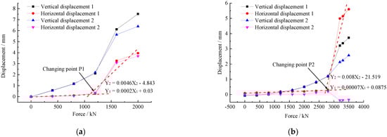 (a) Force–displacement curve of the main arch side; (b) force–displacement curve of the back wall side.