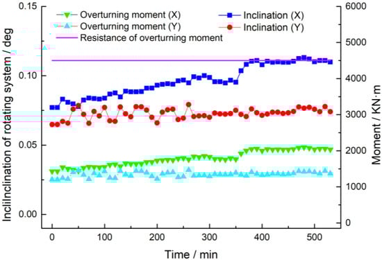 The eccentricity of the rotating system produces the overturning moment of the complete rotating system when the gravity center is not at the axis of the spherical joint center. Because the rotating process is the most crucial and dangerous step of the rotating bridge’s construction, the inclination of the rotating system should be monitored in real time while the rotating construction is in progress [20]. The change in obliquity angle can be used to track the rotating system’s overturning moment. Figure 14 depicts the relationship between the overturning moment and the slope of the back wall: