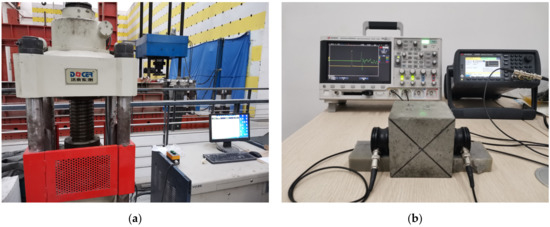During the implementation of the test, in order to reduce the friction between the concrete and the steel plate of the press, lubricating oil was applied to the end face of the test sample. The contact surface of the sample was polished and then coated with couplant. A rubber sleeve was used to fix the ultrasonic probe. Finally, the probe and the sample were squeezed to remove air, so that the two items were in full contact to ensure the testing effect.