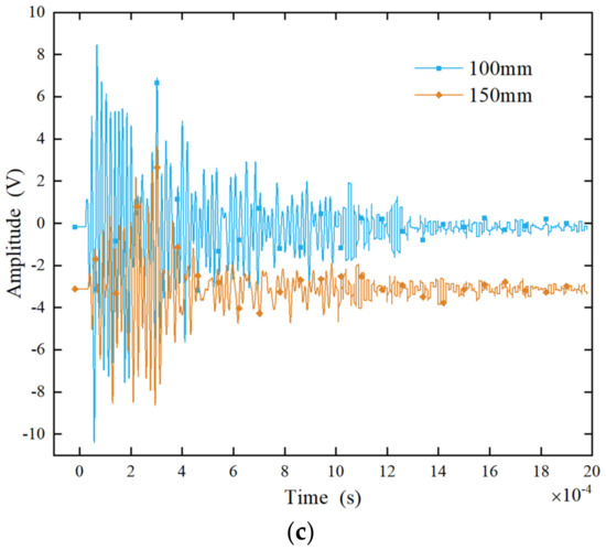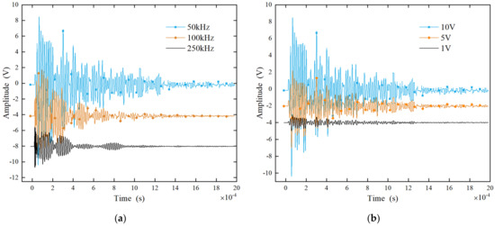 The pre-experiment was carried out under no-pressure conditions to determine the relevant parameters of the ultrasonic coda wave test, namely the ultrasonic excitation frequency (50 kHz, 100 kHz, 250 kHz), the ultrasonic excitation voltage (1 V, 5 V, and 10 V), and the ultrasonic test path length (100 mm and 150 mm, which is the size of the concrete sample). Using the control single-variable method, the original waveforms of the corresponding parameter conditions are shown in Figure 2. The degree of ultrasound scattering in concrete is related to its frequency; usually, lower frequencies correspond to weak scattering. Therefore, the original waveform corresponding to the 50 kHz excitation frequency has a larger amplitude and a longer waveform duration, which is convenient for data processing and analysis. Similarly, the excitation voltage and sample size were determined to be 10 V and 100 mm, respectively. The optimal parameters determined above were used in subsequent ultrasonic wake wave tests and numerical simulation studies: ultrasonic excitation frequency (50 kHz), the ultrasonic excitation voltage (10 V), and the ultrasonic test path length (100 mm, i.e., the concrete sample is a 100 × 100 × 100 mm cube).