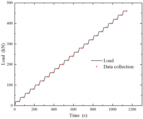 The ultrasonic coda wave test used pulse waves as the source signal. Before the start of the test, the parameters of instruments were adjusted. Before loading, the ultrasonic coda wave test system was started, and the waveform at the moment of 0 kN was recorded. When the load reached 20 kN, the pressure remained constant for 40 s, and signal was recorded at 30 s. Then, the ultrasonic signal was recorded for every 20 kN increase in the load. The loading step and data acquisition control are shown in Figure 3 (taking the C40 concrete specimen as an example), and the loading and ultrasonic test process is shown in Figure 4.