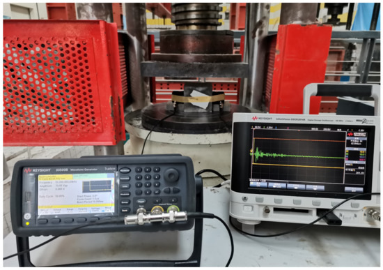 The equipment required for the test includes a pressure loading system and an ultrasonic coda wave test system, as shown in Figure 1. The pressure loading system is a YAN-2000 electrohydraulic servo pressure testing machine (Jinan Dongtest Testing Machine Technology Co., Ltd., Jinian, China). The ultrasonic coda wave test system consists of a signal generator, sensor, oscilloscope, signal amplifier, and corresponding signal lines (33522B arbitrary function generator, DSOX2014G dual-channel color digital oscilloscope, Keysight Technologies, USA. Sensor, 25K-P28F, 50K-P28F, 100K-P40F, 0.25P-40F, Guangdong Goworld Co., Ltd., Shantou, China).
