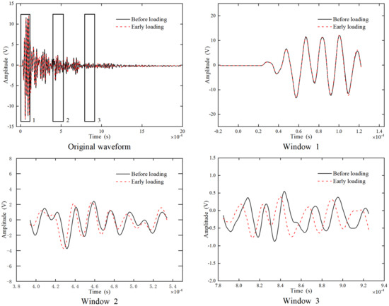 The changes in internal damage of concrete were detected through the coda wave interferometry method, mainly to determine the small difference between the coda wave waveforms before and after the concrete is loaded. A comparison of the received signal waveforms before and at the beginning of loading is shown in Figure 5. In time window 1, the two received signals are completely coincident, which ensures the repeatability of the wave source. In time windows 2 and 3, there is a phase difference between the two signals that gradually increases. Comparing windows 1, 2, and 3 proves that the coda wave is very sensitive to small changes in the random medium of concrete.