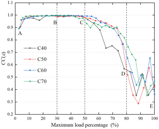 The value of the cross-correlation coefficient ranges from 0 to 1. A value of 0 means that the two waveforms are completely uncorrelated; 1 means that the two waveforms are completely the same [23]. Figure 6 shows the correlation between the coda wave cross-correlation coefficient and the maximum load percentage of the concretes. Within 50% of the maximum load percentage (A–B–C), the correlation coefficient of each concrete is approximately equal to 1, so the corresponding wave velocity change is linear and uniform [36]. When the maximum load percentage is between 50–80% (C–D), the cross-correlation coefficient decreases continuously, indicating that coda wave propagation is strongly affected by the internal damage to the concrete, which causes the waveform to be distorted. As the load exceeds 80% of the maximum load percentage (D–E), the cross-correlation coefficient exhibits a larger range of fluctuations based on further reduction, indicating that the typical causing of scatter inside the concrete, that is, the cracks, has further widened or linked up.