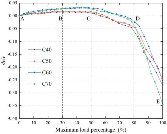 The curves of the maximum load percentage–wave velocity change rate of the four strengths of concrete samples are shown in Figure 7. According to the trend of the changes, the curve can be divided into four parts: strengthening (A–B), stabilizing (B–C), weakening (C–D), instability (D–E).