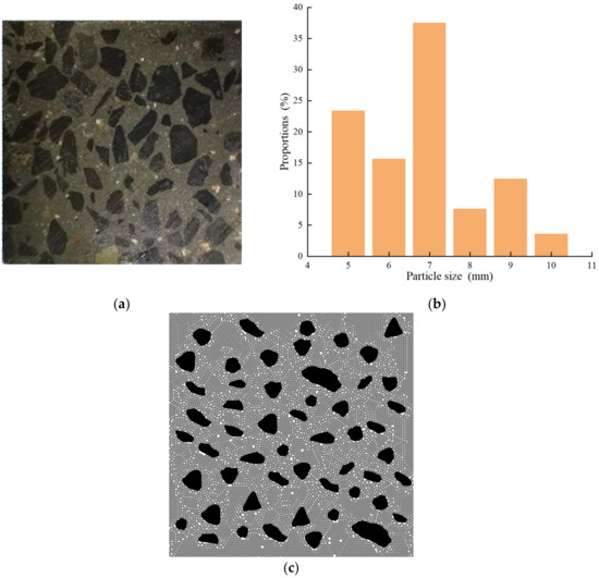 First, a picture of the coarse basalt aggregate was taken (Figure 8a), closed multiline segments were used to outline the boundary of the aggregate, and 21 types of coarse bone particle patterns were finally selected. The abovementioned particle geometry model was imported into the software to generate a clump template, which represents the real coarse aggregate. The contact model between particles was defined as a parallel bonding model in which there are forces and moments between the particles. This feature is consistent with the material stress on the inside of the structure when the actual concrete is under pressure. The boundary wall was generated according to the size of the concrete sample, and then the “distribute” command was used in the wall area to randomly generate the set size particle unit to represent the mortar. Subsequently, clump bodies are generated randomly in the corresponding particle size gradation range, as shown in Figure 8b. In this paper, the “solve aratio” command in PFC2D is used to make the initial sample reach the equilibrium state. The aratio (or average ratio) is the ratio of the average value of the unbalanced force magnitude (i.e., the magnitude of the sum of the contact forces, body forces, and applied forces) on overall bodies to the average value of the sum of the magnitudes of the contact forces, body forces and applied forces on overall bodies. In this simulation, the value of aratio is set to 1e-4. In the enclosed space surrounded by the surrounding walls, the particles are calculated to an equilibrium state, and the unbalanced force gradually decreases, making aratio less than 1e-4, which has no impact on the subsequent calculation. The specimen is not consolidated; in other words, the initial pressure is 0. The voids in the concrete c in the equilibrium state are all distributed, and there is a certain contact between the particles, as shown in Figure 8c.