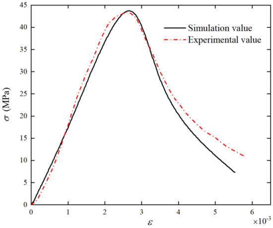 In this paper, five meso-parameters, namely the elastic modulus , stiffness ratio , friction coefficient , parallel bond normal strength , and parallel bond tangential strength , are calibrated. Using the control single variable method, the changes in the peak strength and damage failure mode of concrete caused by the change of meso-parameters of each particle are discussed. After the values of each meso-parameter are tested, the parameter set that best matches the stress–strain curve obtained from the experiment is selected. This chapter presents the established numerical model of C40 concrete specimen, and the discussion values and final simulation values of each particle meso-parameter are shown in Table 4.