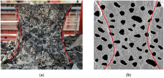 The uniaxial compression simulation results of the C40 concrete sample were compared with the test results. The main mechanical parameters are shown in Table 5. Figure 9 shows that before the concrete reaches the peak stress, the experimental and simulated stress–strain curves are almost the same, but there is a clear difference in the stress softening stage. Compared with the experimental value, the simulated curve yields and decreases earlier. The main reason is that the two-dimensional model used in the simulation cannot truly reflect the three-dimensional compression situation. The experimental and simulated values are very close, and the deviation is small. Figure 10 shows that the concrete failure modes obtained by the uniaxial compression experiment and PFC2D simulation are the same; both are “C”-shaped crack fracture zones.