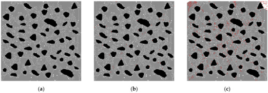 Using the abovementioned concrete uniaxial compression simulation model, the development process of concrete internal cracks is obtained, as shown in Figure 11. At the initial stage of loading, the particle stress level in the model is low, and a small number of particles gradually generate microcracks. Early damage occurs between the coarse aggregate and small particle mortar on the upper bearing surface and the middle of the model. Subsequently, stress redistribution occurs in the concrete sample, and the stress concentration phenomenon is easily formed in the place where the microcrack occurs, which intensifies its continuous expansion. As the load further increases, the original cracks at the interface between the aggregate and the mortar, as well as inside the mortar, will extend, while many new cracks will appear at the interface of other aggregates. When peak stress is reached, displacement of the block under the action of external force is increased so that the local cracks become fully expanded and linked up, forming evident macroscopic cracks.